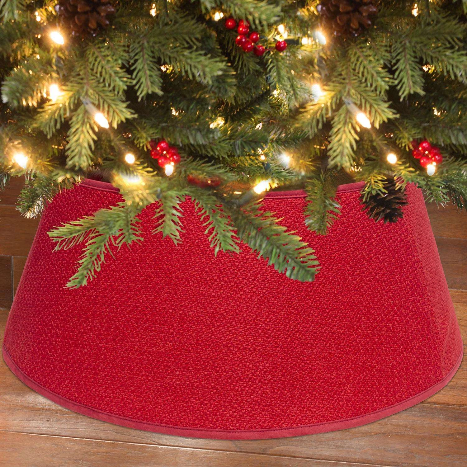 Bring the beauty and magic of your Christmas tree decorations all the way to the floor with this unique red boucle textured Christmas tree collar! A great addition to a traditional tree skirt or use alone.Quick and easy to assembleFits most natural and artifical tree base sizesFolds flat for easy storage